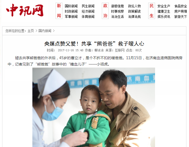 以下报道来自中讯网,如想了解更多“熊爸爸”的相关信息,可以拨打热线电话:0531-86953333,也可以到济南血液病医院看望,医院地址:济南市天桥区北园大街204号济南血液病医院。